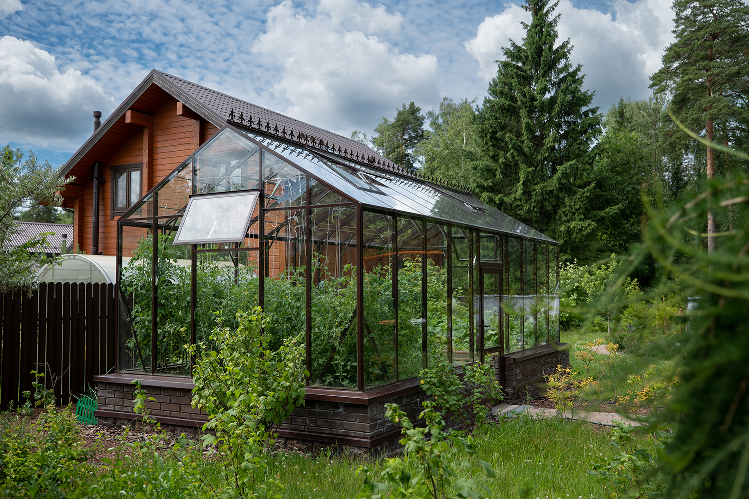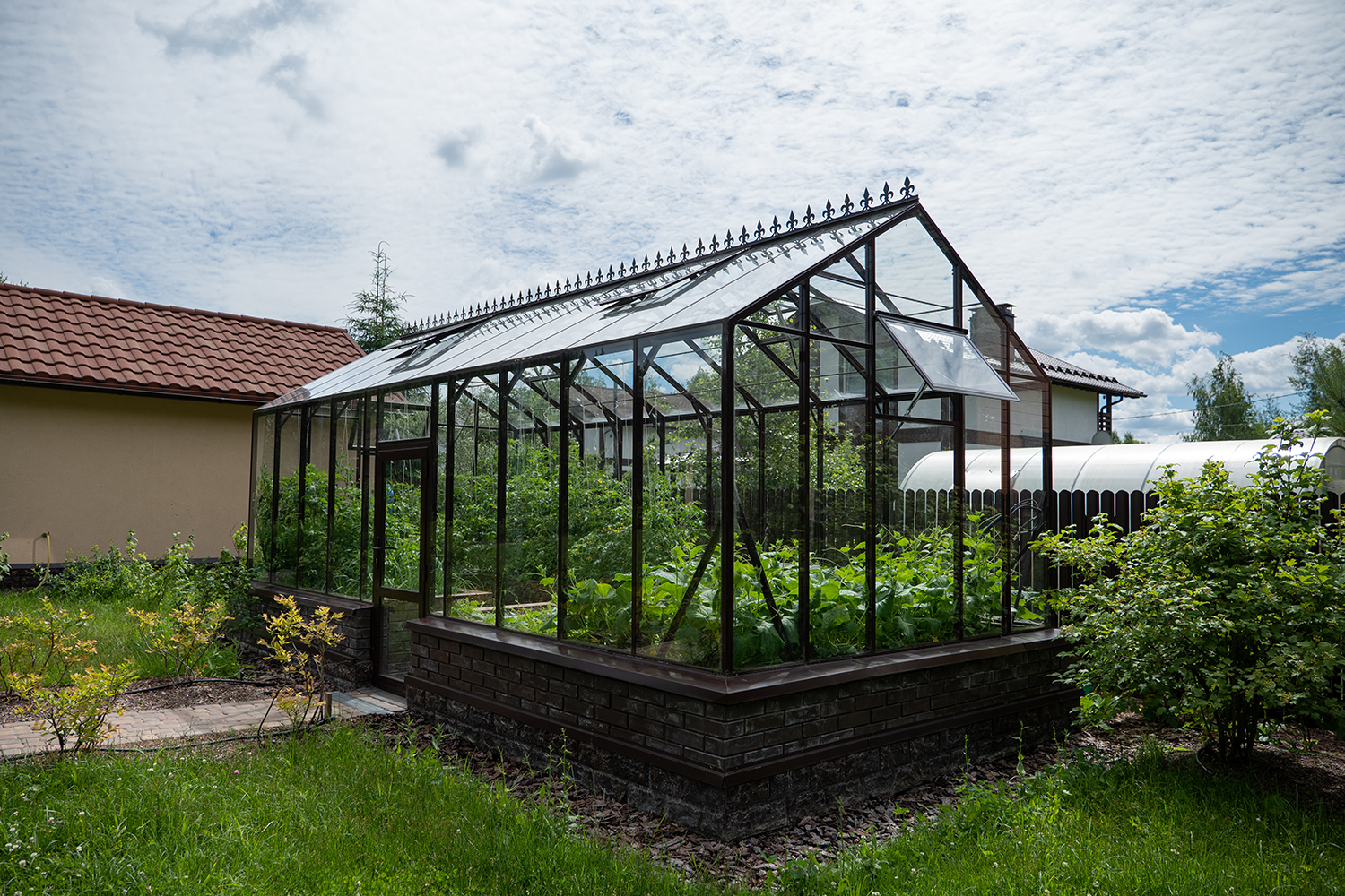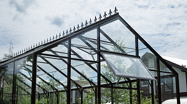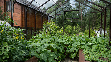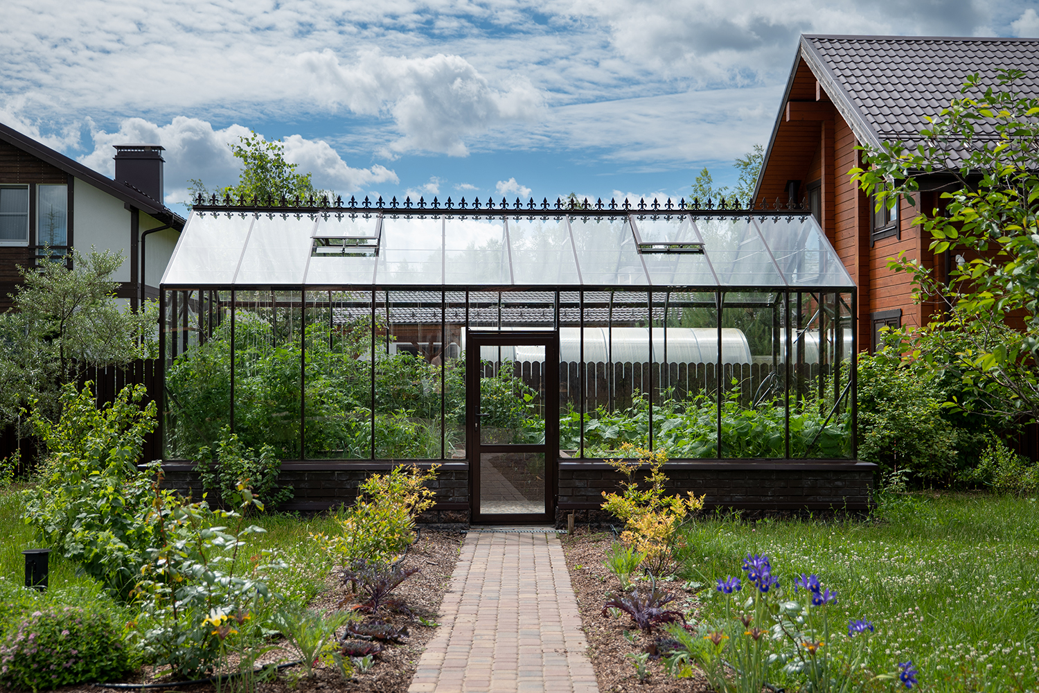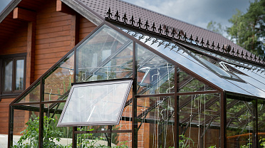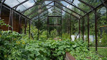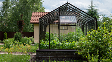 Боковое размещение входа формирует более гибкую планировку и удобную логику использования пространства. Такое решение упрощает зонирование внутри и делает перемещение более естественным, позволяя органично вписать теплицу в участок и создать продуманную и комфортную рабочую среду.