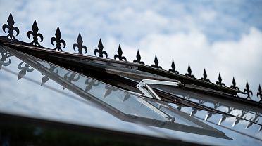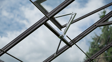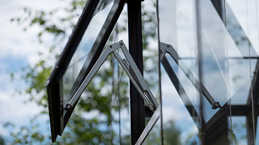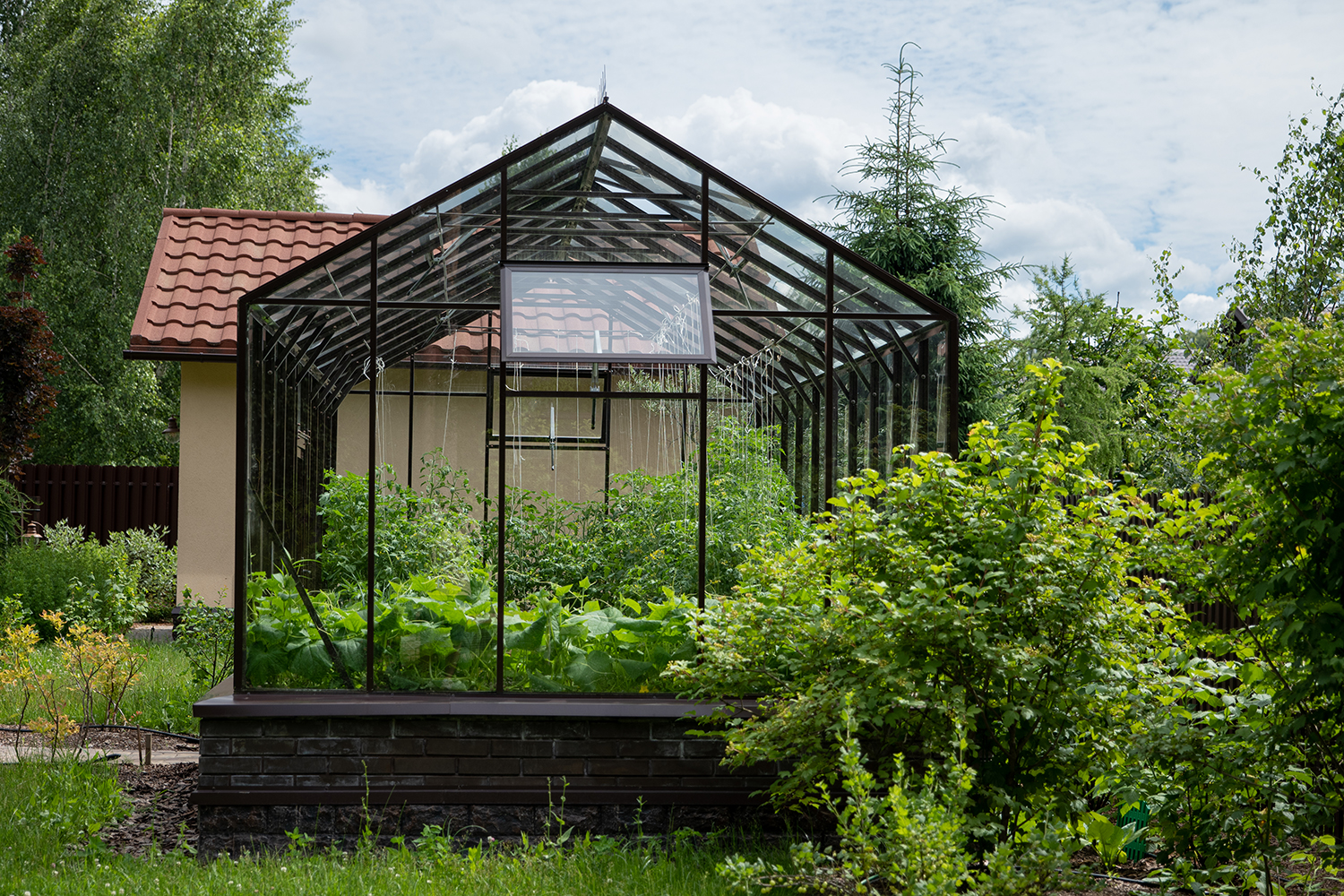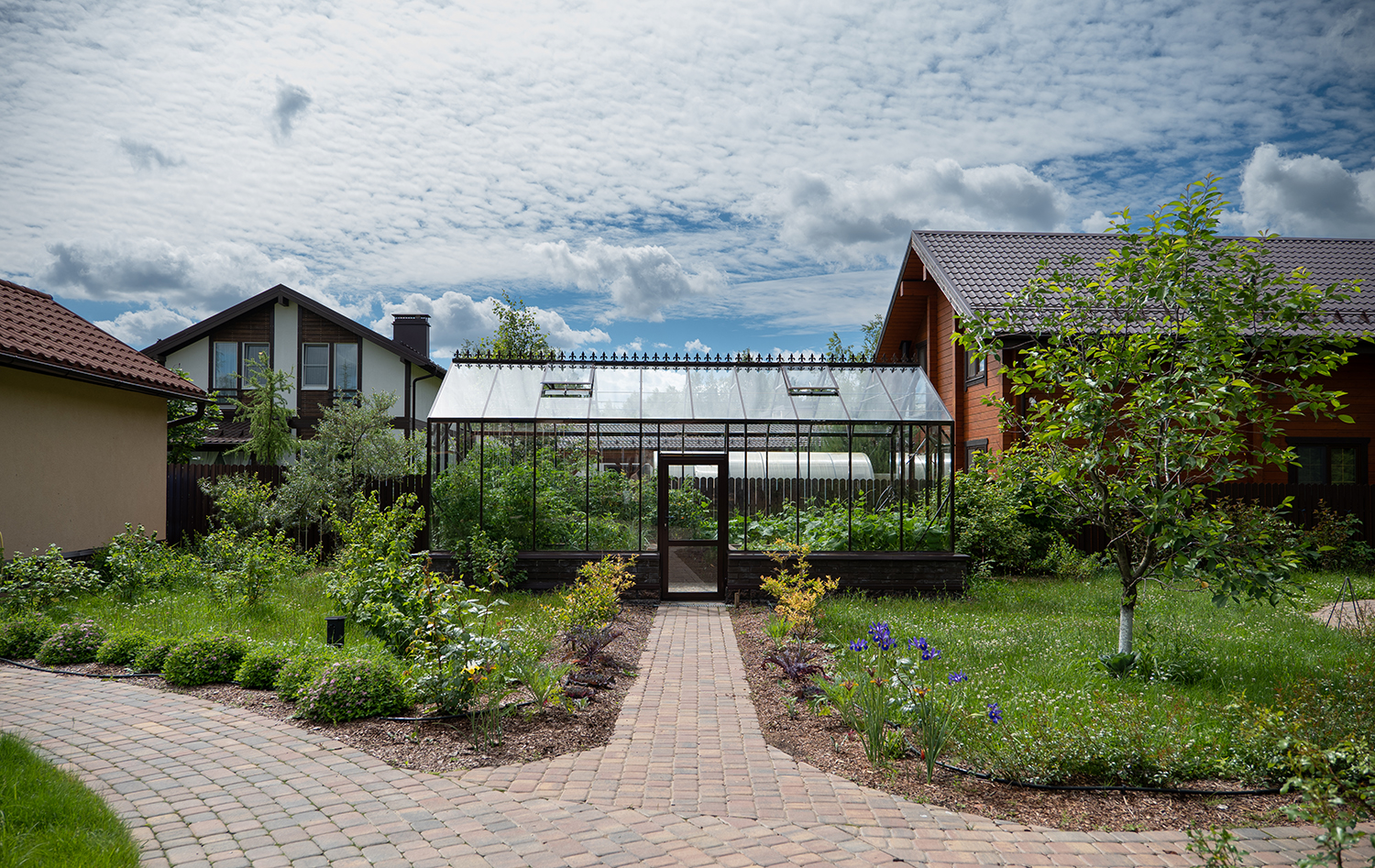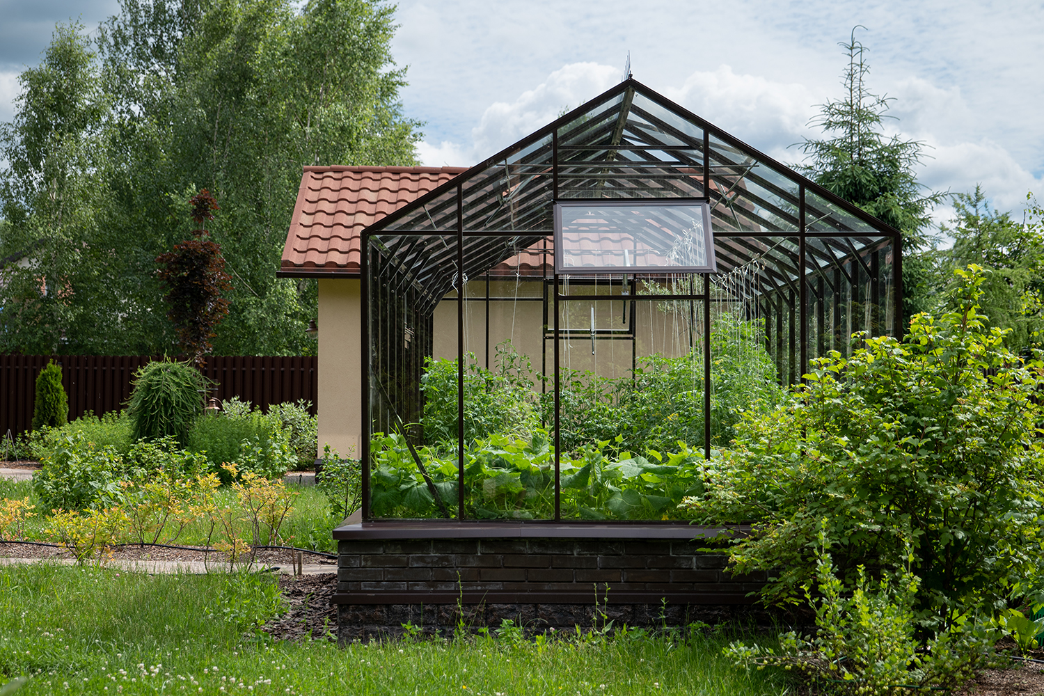 Боковое размещение входа формирует более гибкую планировку и удобную логику использования пространства. Такое решение упрощает зонирование внутри и делает перемещение более естественным, позволяя органично вписать теплицу в участок и создать продуманную и комфортную рабочую среду.